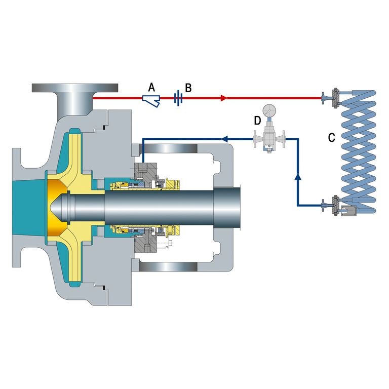 Recirculation from a circulation device in the seal chamber through a cooler and back into the seal chamber.