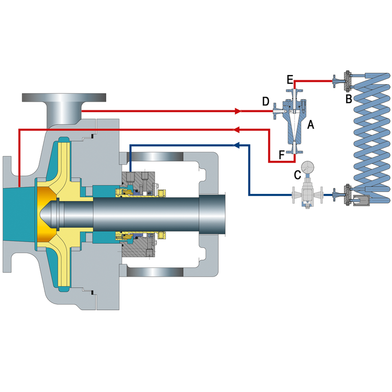 Recirculation from the pump discharge through a cyclone separator delivering the clean fluid to a cooler and then to the seal chamber. The solids are delivered to the pump suction line.